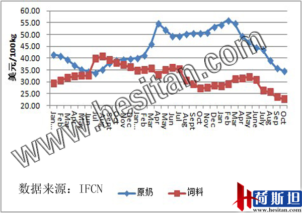 荷斯坦网11月20日讯:IFCN(国际牧场联盟)最新数据显示,2014年10月份全球原奶格继续保持下跌走势,至34.8美元/100Kg,按汇率折算合2.15元/Kg,环比下降3.1%,同比下降31.1%。