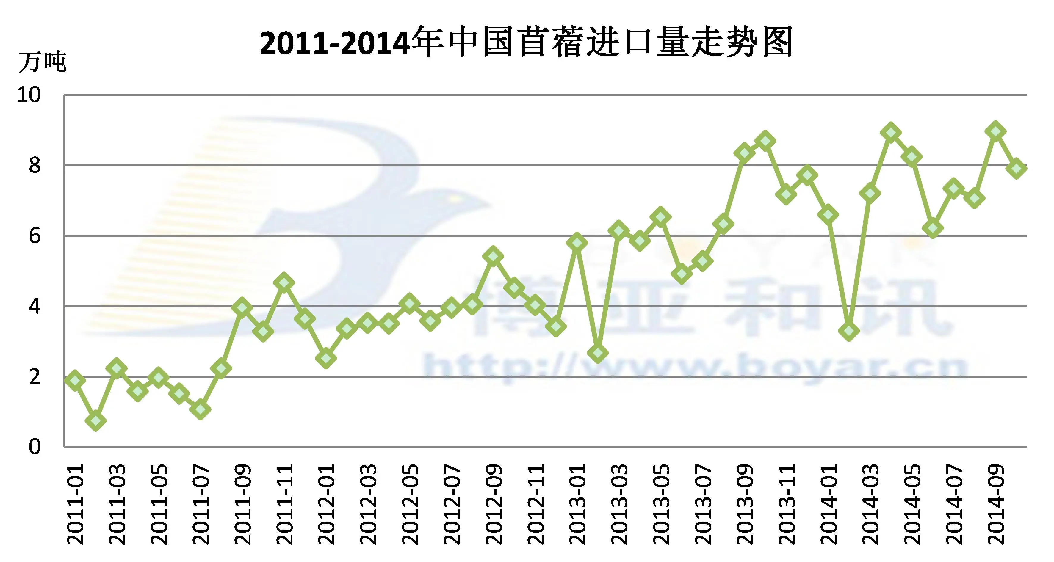点评:随着我国奶牛养殖业规模化的快速发展,对苜蓿草的需求迅猛增长,但我国“振兴奶业苜蓿发展行动”起步时间不长,需要大量进口苜蓿弥补国内不足。但长久以来,中国苜蓿进口市场主要以美国为主,此次西班牙获批,将在一定程度上打破美国的垄断局面。西班牙是世界第二大脱水苜蓿草出口国,产量近160万吨,出口占其产量的60%之多。